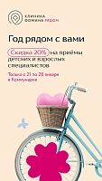Это наш общий праздник! Приходите в клинику с 21 по 28 января и получите скидку 20% на приёмы детских и взрослых специалистов по промокоду «ГодРядомКоммунарка».